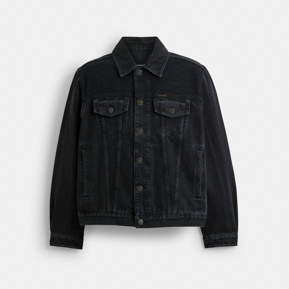 An updated take on a classic trucker style this denim jacket features a Signature jacquard yoke for heritage style. Crafted of organic cotton made without the use of harmful chemical fertilizers and pesticides the classic-fit design is finished with chest pockets slip pockets and a leather patch. COACH?? Men’s Black Denim Jacket in Organic Cotton, Size Medium