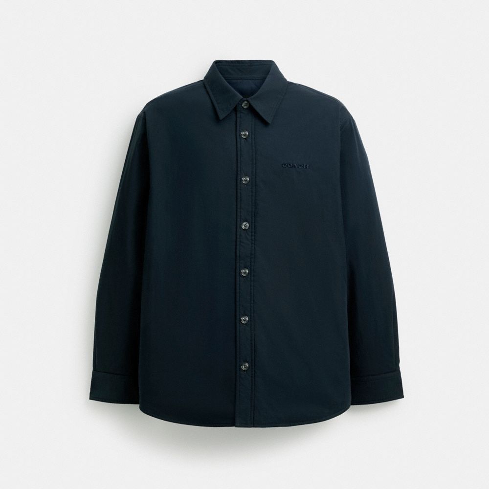 A great layering piece for transitional weather this slightly oversized cotton-blend shirt jacket features a diamond-quilted padded lining for added warmth. The versatile style is finished with welt pockets and our tonal embroidered name at the chest for a heritage touch. COACH?? Men’s Button Up Shirt Jacket in Blue, Size Medium 56% Polyester, 44% Viscose Lining