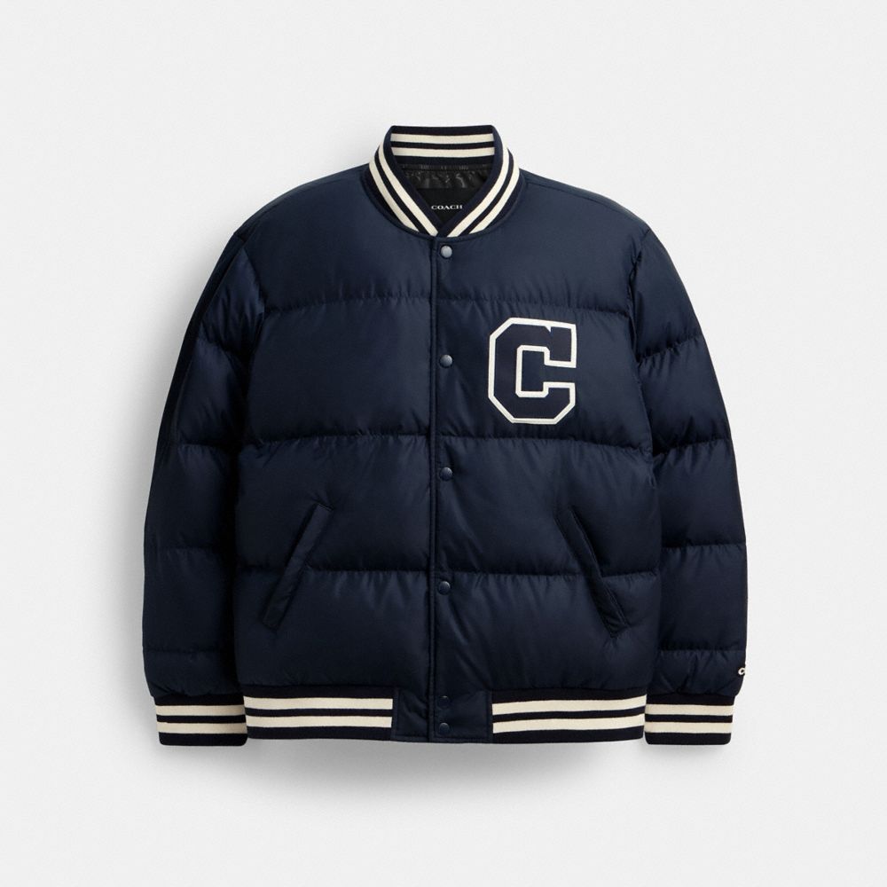 A cold weather update of an iconic Coach silhouette this sporty snap-front Varsity jacket features a warm pillowy down fill. Crafted of recycled polyester inspired by our commitment to rethinking and reducing our impact on the planet the classic-fit style is finished with slip pockets Varsity Stripe ribbing a woven Signature patch and our name embroidered at the sleeve. COACH?? Men’s Down Varsity Jacket in Blue, Size Medium 100% Polyester