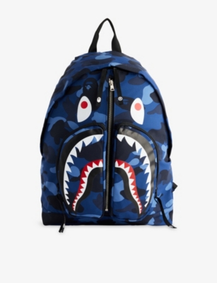 A Bathing Ape woven backpack100% polyamide; lining 100% polyesterZip fasteningCurved shape, top handle, three zip pockets and shark print at front, two adjustable padded shoulder straps and mesh padded panel at back, all-over camouflage print, silver-toned hardware, one main compartment, internal slip pocket and brand patch, fully linedHeight 45cm, width 32cm, depth 14cm, strap length 91cm, strap drop 41cmWipe with a clean, dry cloth