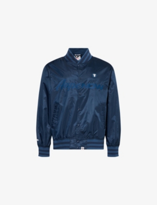 AAPE woven varsity jacket100% nylonPopper fastening at front V-neck, ribbed trims, two jetted pockets at front, embroidered brand detailing at front and back, brand logo-patch at front, engraved button detailingHand wash coldSize medium: length 29.1in / 74cm, chest 21.8in / 55cmModel is 6ft 2in/1.88m and wears a size mediumMidweight, non-stretch