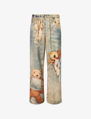 Acne Studios denim jeans100% cottonExposed button and concealed button-fly fastening at frontLoose fit, high-rise, wide leg, belt loops, five pockets, brand print at back, all-over trompe-l’oeil teddy bear print, faded washMachine wash coldSize medium: rise 13in / 33cm, inside leg 31in / 79cm, leg opening 20in / 51cmModel is 6ft 2in/1.88m and wears a size mediumMidweight, slight stretch