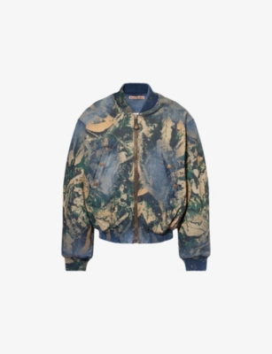 Acne Studios denim jacket100% cotton; filling 100% polyester; lining 65% polyester, 35% cottonExposed zip fastening at frontRelaxed fit, band collar, dropped shoulders, long sleeves, two side press-stud slip pockets, rib-knit trims, branded hardware, all-over seasonal abstract print, fully linedDry cleanSize UK 40: length 29in / 73cm, chest 44in / 101cmModel is 6ft 2in/1.88m and wears a size UK 40Heavyweight, non-stretch