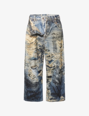 Acne Studios denim jeans100% cottonExposed button and concealed zip-fly fastening at frontBaggy fit, mid rise, super wide leg, structured waistband with belt loops, five pockets, logo patch at back, distressed design, all-over seasonal ‘torn scribble’ trompe l’oeil printMachine wash at 30°CMade in ItalySize UK 32: rise 15in / 38cm, inside leg 28.8in / 72.5cm, leg opening 24in / 61cmModel is 6ft 2in/1.88m and wears a size UK 32Midweight, non-stretch
