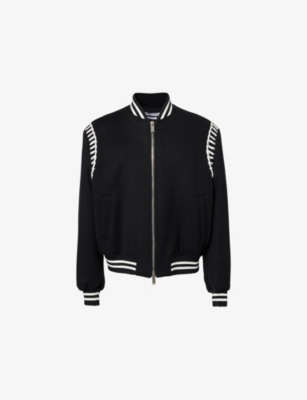 Alexander McQueen wool-blend bomber jacket88% wool, 10% polyamide, 2% elastaneZip fasteningRound collar, long sleeves, blanket stitch around armhole, two front pockets, lined, ribbed striped trimsDry cleanMade in ItalySize UK 40: length 26in / 66cm, chest 52in / 132cmModel is 6ft 2in/1.88m and wears a size UK 40Midweight, non-stretch