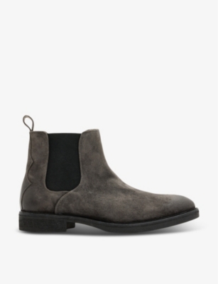 AllSaints suede boots100% cow leatherPulls onAlmond toe, decorative counter piece, elasticated gusset, brand logo heat-stamped heel, comfortable fixed cushioned insoleSpecialist leather cleanUpper: 100% cow leatherMade in PortugalLining: 100% goat leatherSole: 95% rubber, 5% leather-board