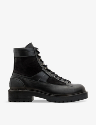 AllSaints leather boots100% leatherLace-up fasteningRound closed toe, eyelet embellishment, suede panels, logo embossed at the side, silver-tone hardware, chunky soleSpecialist leather cleanUpper: 100% leatherLining: 100% leatherSole: 100% rubber