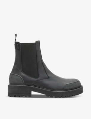 AllSaints leather Chelsea boots100% leatherSlips onHigh ankle rise, closed round toe, branded logo at back, elasticated panels at side, pull tab at back, chunky tread soleSpecialist leather cleanUpper: 100% leatherLining: 100% leatherSole: 33% pvc, 33% EVA, 33% rubber