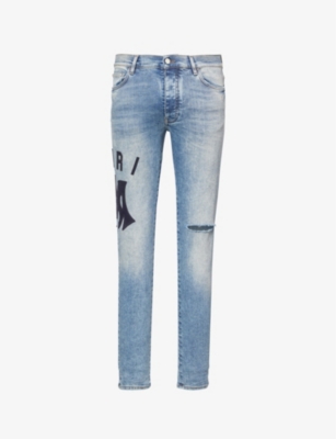 Amiri skinny-leg denim jeans100% cottonButton and button-fly fasteningSlim fit, skinny leg, five pockets, brand motif patch on leg, brand patch at back, faded wash, distressed at detail at knees, branded hardwareMachine wash coldSize UK 32/34: rise 10in / 25cm, inside leg 34in / 86cm, leg opening 11in / 27.9cmModel is 6ft 2in/1.88m and wears a size UK 32Midweight, slight stretch