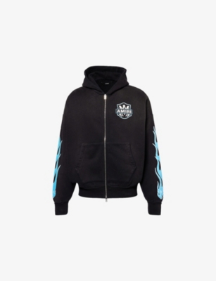 AMIRI cotton-jersey hoodie100% cotton; lining 100% cotton; trims 99% cotton, 1% elastaneExposed zip fastening at frontRelaxed fit, lined hood, dropped shoulders, flame print at long sleeves, two patch pockets at front, brand print at front and back, graphic print at back, faded wash, ribbed trimsDry cleanMade in ItalyModel is 6ft 2in/1.88m and wears a size mediumMidweight, stretchy
