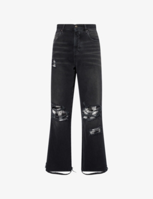 AMIRI denim jeans100% cotton; pocketlining 65% polyester, 35% cottonExposed button and concealed button-fly fastening at frontBaggy fit, high-rise, wide leg, belt loops, five pockets, brand patch and brand plaque at back, all-over contrast check print panels and cut-out, faded wash and whiskering, distressedDry cleanMade in ItalySize UK 30: rise 13in / 34cm, inside leg 32in / 81cm, leg opening 20in / 51cmModel is 6ft 2in/1.88m and wears a size UK 30Lightweight, slight stretch