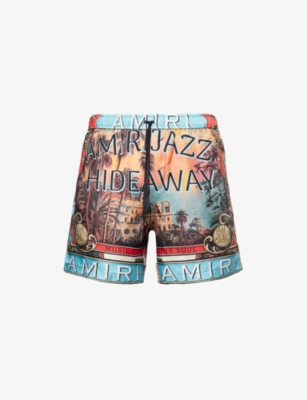 AMIRI silk shorts100% silkPulls onRegular fit, elasticated waistband with drawstring, two slip pockets at side, all-over graphic printDry clean onlyMade in ItalyModel is 6ft 2in/1.88m and wears a size mediumLightweight, non-stretch