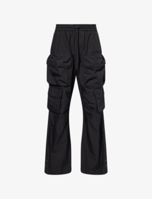 AMIRI cotton blend cargo trousers72% cotton, 28% polyamide; lining 100% viscoseSelf-tie fastening at waist Elasticated drawstring waist, straight leg, embroidered brand patch at front, eight pockets, buttoned hemsDry cleanMade in ItalyModel is 6ft 2in/1.88m and wears a size mediumLightweight, non-stretch