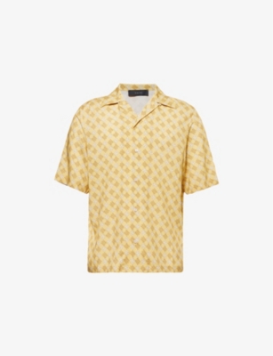 AMIRI woven shirt100% viscoseExposed button fastening at frontRegular fit, spread collar, short sleeves, all-over monogram print, straight hemDry clean onlyMade in ItalySize medium: length 29in / 74cm, chest width 22in / 55cmModel is 6ft 2in/1.88m and wears a size mediumLightweight, non-stretch