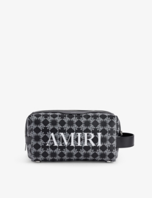 AMIRI woven washbag60% cotton, 25% linen, 15% polyurethane; lining 100% lyocellZip fasteningRectangular shape, handle at side, brand print and foiled branding at front, all-over monogram print, textured, four protective feet at base, silver-toned hardware, one main compartment, internal brand patch, fully linedWipe with a clean, dry clothHeight 13cm, width 2.35cmMade in Italy