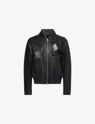 Amiri leather jacket100% lamb leather; lining 100% viscoseExposed zip fastening at frontRelaxed fit, point collar, long sleeves with buttoned cuffs, logo embroidery at chest, all-over grained leather, two zipped pockets at front, lined, internal slip pocket, elasticated hemSpecialist leather cleanMade in ItalySize UK 38: length 23.5in / 60cm, chest 44in / 112cmModel is 6ft 2in/1.88m and wears a size UK 38Midweight, non-stretch