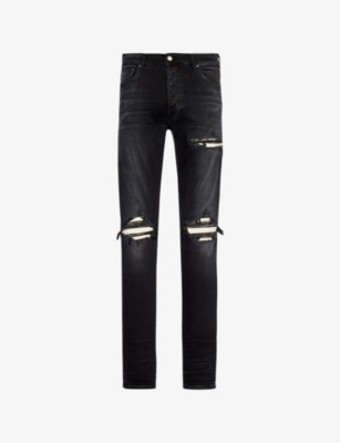 AMIRI stretch-denim jeans92% cotton, 6% elastomultiester, 2% elastaneButton and zip-fly fasteningSlim fit, mid-rise, tapered leg, structured waistband with belt loops, five pockets, brand patch and metal plaque at back, faded wash, distressed patches, branded hardwareDry clean onlyMade in USASize UK 32: rise 10.5in / 27cm, inside leg 32.5in / 83cm, leg opening 12in / 31cmModel is 6ft 2in/1.88m and wears a size UK 32Midweight, stretchy