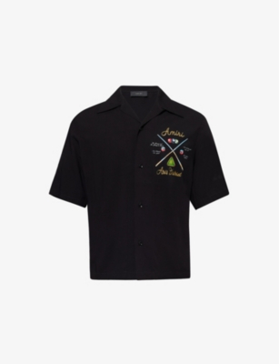 AMIRI woven bowling shirt100% viscoseExposed button fastening at frontRegular fit, spread collar, short sleeves, pool cue graphic print at chest and back, straight hemDry clean onlyMade in ItalySize medium: length 26in / 66cmModel is 6ft 2in/1.88m and wears a size mediumLightweight, non-stretch