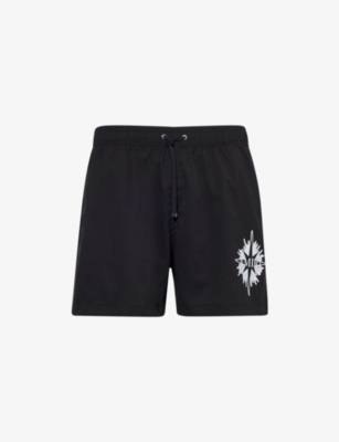 AMIRI swim shorts100% polyester; lining 100% polyesterRegular fit, mid rise, elasticated drawstring waistband, brand star print at front, two side zip pockets, branded silver-toned hardware, logo patch embroidered at back, one rear flap pocket, eyelet embellishment at backMachine wash at 30°CModel is 6ft 2in/1.88m and wears a size mediumLightweight, non-stretchFor hygiene reasons, we are unable to exchange or refund this product, unless faulty.