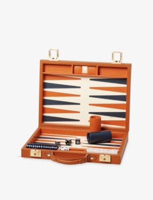 Aspinal of London Leather Backgammon Set100% leatherSolid wood box frame, contrast-toned leather playing points, 28mm acrylic chips, four standard throwing dice, contrast-toned leather dice cups, one doubling cube, magnetic soft closureLength 23.3cm, width 12.5cm, depth 6cmWipe with a clean, dry cloth