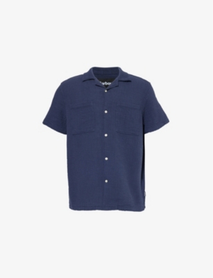 Barbour cotton shirt100% cottonExposed button fastenings at frontCamp collarRelaxed fit, short sleeves, two patch pockets at chest, side slits, brand tab at sideMachine wash at 30°CSize medium: length 28in / 71.5cm, chest 44in / 112.5cmModel is 6ft 2in/1.88m and wears a size mediumMidweight, non-stretch