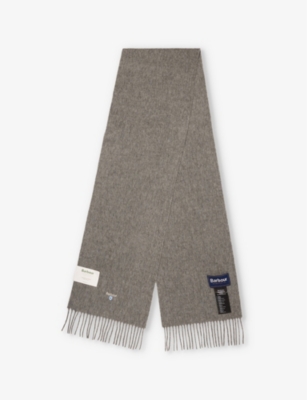 Barbour wool scarf100% woolSelf-tie fasteningRectangular silhouette, brand embroidery at front, fringe trimsLength 196cm, width 26cmDry clean only