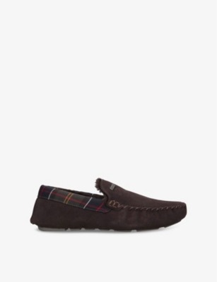 Barbour suede slippers100% suedeSlips onMoccasin-style, brand metal badge at outer, tartan check panels, faux-shearling lined, tread soleSpecialist leather cleanUpper: 100% suede; contrast 100% fabricLining: Faux-shearlingSole: 100% rubber