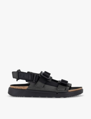 Birkenstock leather and textile flat sandals100% leather and textileAdjustable buckle fasteningAlmond open toe, double strap fastening, adjustable buckles, logo engraved hardware, logo at the strapWipe with a clean, dry clothUpper: 100% leather and textileLining: 100% syntheticSole: 100% synthetic