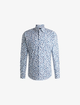 BOSS stretch-cotton shirt98% cotton, 2% elastaneExposed button fastening at frontRegular fit, collar, long sleeves, all-over abstract print, buttoned cuffsMachine wash coldLightweight, slight stretch