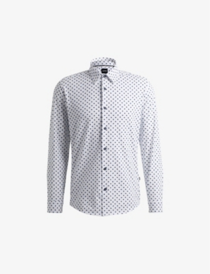 BOSS cotton-blend shirt75% cotton, 25% polyesterExposed button fastening at frontSlim fit, classic collar, long sleeves, buttoned cuffs, all-over graphic printMachine wash coldModel is 6ft 3in/1.91m and wears a size mediumLightweight, non-stretch