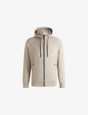 BOSS cotton-blend hoody74% cotton, 17% polyamide, 9% elastane; lining 100% polyester; back panel 96% cotton, 4% elastane; waistband 97% cotton, 3% elastaneExposed zip fastening at frontRegular fit, drawstring hood, long sleeves, ribbed trims, logo patch embroidered at chest, two side zip pockets, flatlock stitchingMachine wash at 30°CMidweight, slight stretch