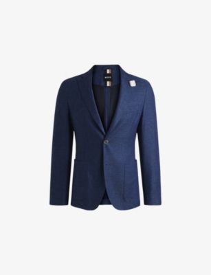 BOSS woven blazer57% viscose, 39% linen, 2% polyamide, 2% elastane; lining 100% viscoseExposed button fastenings at frontSlim fit, notched lapels, long sleeves, buttoned cuffs, welt pocket at chest, single breasted, two patch pockets at front, double vents at backSpecialist dry cleanMidweight, non-stretch