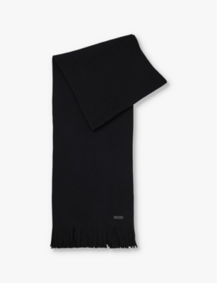 HUGO wool scarf100% virgin woolPulls onRectangular silhouette, faux-leather logo plaque at front, fringed edges, all-over raschel knitLength 170cm, width 25cmSpecialist dry cleanMidweight, non-stretch