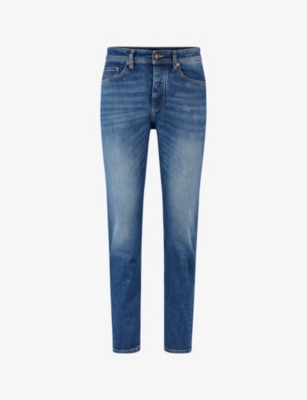 BOSS stretch-denim jeans94% cotton, 5% elastomultiester, 1% elastaneConcealed button fastening at frontRegular fit, tapered leg, mid rise, belt loops, five pockets, faded washMachine wash coldModel is 6ft 2in/1.88m and wears a size UK 32Midweight, slight stretch
