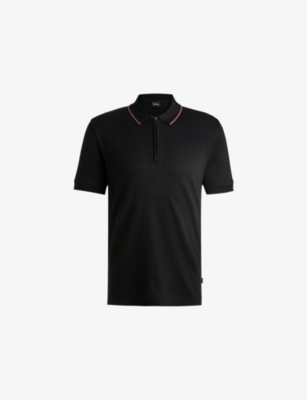BOSS cotton polo shirt100% cottonZip fasteningRegular fit, collar, short sleeves, contrast trim, woven textured finishDry cleanTrue to sizeLightweight, non-stretch
