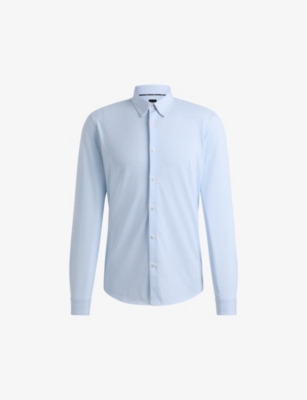 BOSS cotton-blend shirt75% cotton, 25% polyesterExposed button fastening at frontSlim fit, Kent collar, long sleeves, round cuffs, all-over digital printMachine wash mildModel is 6ft 3in/1.91m and wears a size mediumMidweight, non-stretch