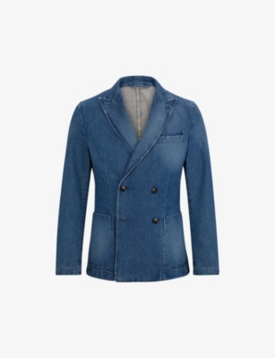 BOSS denim blazer80% cotton, 20% recycled cottonExposed button fastening at frontSlim fit, lapel collar, welt pocket at chest, long sleeves, two pockets at the side, double breastedMachine wash mildModel is 6ft 1in/1.85m and wears a size UK 38Midweight, non-stretch