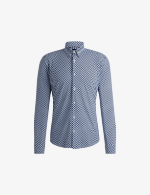 BOSS stretch-woven shirt76% polyamid, 24% elastaneExposed button fastening at frontSlim fit, Kent collar, long sleeves, round cuffs, all-over micro square printMachine wash mildModel is 6ft 2in/1.88m and wears a size mediumMidweight, stretchy