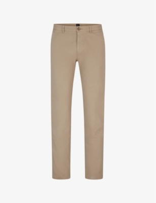 BOSS stretch-cotton chinos67% cotton, 31% lyocell, 2% elastaneExposed button and concealed zip-fly fastening at frontSlim fit, mid-rise, belt loops, two pockets at the side, branded hardware, straight legMachine wash coldMidweight, slight stretch
