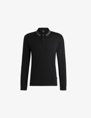 BOSS cotton-jersey polo shirt100% cottonExposed button fastening at frontSlim fit, collar, long sleeves, striped trim to the collar, flat-knit trims to collar and cuffsMachine wash coldLightweight, non-stretch