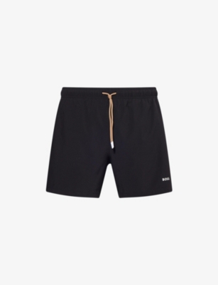 BOSS swim shorts91% polyester, 9% elastane; lining 100% polyesterRegular fit, elasticated drawstring waistband, two side slip pockets, logo print at front, one rear flap pocket, tricolour stripe at back waistband, internal mesh briefMachine wash at 30°CMade in TurkeyModel is 6ft 2in/1.88m and wears a size mediumLightweight, slight stretchFor hygiene reasons, we are unable to exchange or refund this product, unless faulty.