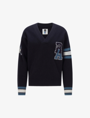 BOSS x Russell Athletic wool jumper100% woolPulls onRegular fit, V neckline, logo patch at the chest, long sleeves, ribbed at the cuffs and hemMachine wash coldMidweight, non-stretch