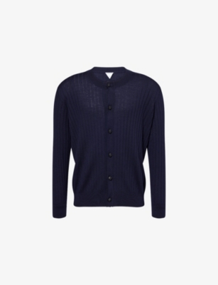 Bottega Veneta wool cardigan100% wool; trims 89% wool, 10% polyamide, 1% elastaneExposed button fastenings at frontRegular fit, crewneck, long sleeves, intrecciato leather buttons at front, ribbed trims all-over ribbed knitDry cleanMade in ItalyModel is 6ft 2in/1.88m and wears a size mediumLightweight, stretchy