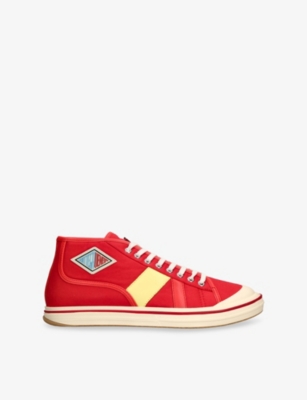 Bottega Veneta canvas and leather mid-top trainers100% cotton; trims 100% leatherLace-up fasteningClosed round toe, mid-top silhouette, brand hardware at tongue, leather trims, brand appliquƩ at sides, striped trim at midsoleWipe with a clean, dry clothMade in ItalyUpper: 100% cotton; trims 100% leatherLining: 100% cottonSole: 100% rubber