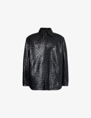 Bottega Veneta leather shirt100% lamb leatherExposed button fastening at frontSpread collarButtoned cuffsRelaxed fit, collar, long sleeves, straight yoke at back, all-over double-faced weave, all-over smooth leather, unlined, curved hemSpecialist leather cleanSize UK 40: length 30in / 78cm, chest 50in / 127cmModel is 6ft 3in/1.91m and wears a size UK 40Heavyweight, non-stretch