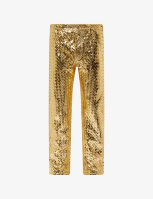 Bottega Veneta leather trousers100% lamb leatherExposed button and concealed zip-fly fastening at frontRegular fit, mid-rise, straight leg, structured waistband with belt loops, five pockets, silver-toned hardware, all-over Intrecciato weave, laminated finishSpecialist leather cleanMade in ItalySize UK 32: rise 12in / 31cm, inside leg 32in / 81cm, leg opening 18in / 46cmModel is 6ft 2in/1.88m and wears a size UK 32Midweight, non-stretch