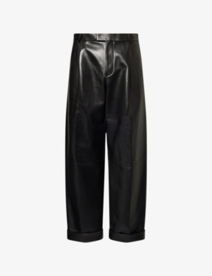 Bottega Veneta leather trousers100% leatherConcealed button, hook-and-eye and zip-fly fastenings at frontRegular fit, mid-rise, straight leg, belt loops, pleats at front, side slip pockets, welt pocket at back, fold-over hemSpecialist leather cleanMade in ItalySize UK 32: rise 14in / 36cm, inside leg 31.5in / 80cm, leg opening 19in / 48cmModel is 6ft 2in/1.88m and wears a size UK 32Midweight, non-stretch
