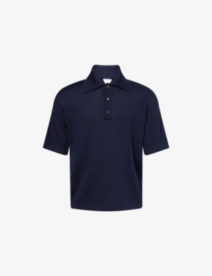 Bottega Veneta wool polo shirt100% wool; trims 96% wool, 3% polyamide, 1% elastaneExposed button fastenings at frontPolo collarRelaxed fit, collar, three-button placket, dropped shoulders, short sleeves, ribbed trims, knittedDry cleanMade in ItalyModel is 6ft 2in/1.88m and wears a size mediumLightweight, stretchy
