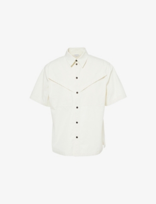 Bottega Veneta cotton shirt100% cottonExposed button fastenings at frontSpread collarRegular fit, short sleeves, patch pockets at chest, slits at hem sidesSpecialist dry cleanSize UK 40: length 28in / 71.5cm, chest 44in / 112cmModel is 6ft 2in/1.88m and wears a size UK 40Midweight, non-stretch