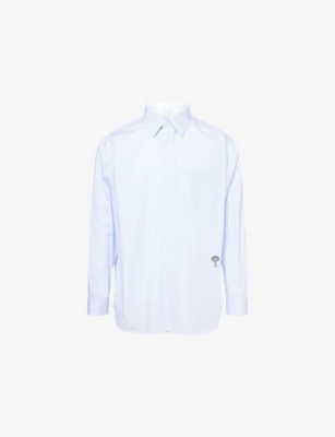 Bottega Veneta cotton-poplin shirt100% cotton; lining 100% cottonExposed button fastenings at frontStraight-point collarRegular fit, collar, long sleeves, buttoned cuffs, one chest patch pocket, graphic embroidery at hem, all-over stripe print, curved hemDry cleanMade in ItalySize UK 40: length 34in / 86cm, chest 44in / 111cmModel is 6ft 2in/1.88m and wears a size UK 40Lightweight, non-stretch